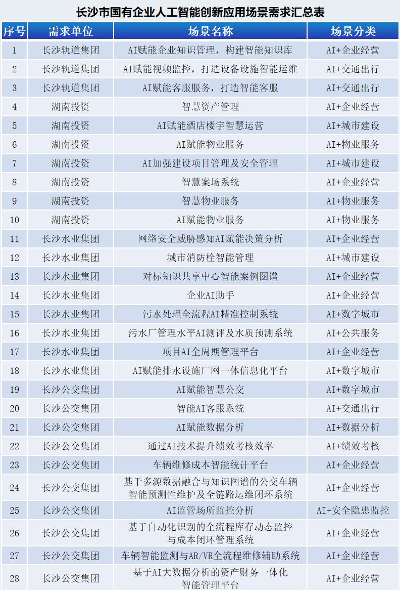 為充分發(fā)揮國(guó)有企業(yè)需求規(guī)模大、應(yīng)用場(chǎng)景多的綜合優(yōu)勢(shì),加快推動(dòng)長(zhǎng)沙人工智能產(chǎn)業(yè)高質(zhì)量發(fā)展,力爭(zhēng)實(shí)現(xiàn)更多標(biāo)志性成果與突破性進(jìn)展,持續(xù)塑造產(chǎn)業(yè)新優(yōu)勢(shì)、培育發(fā)展新動(dòng)能,長(zhǎng)沙市國(guó)資委率先發(fā)布首批“人工智能創(chuàng)新應(yīng)用場(chǎng)景”需求清單。
