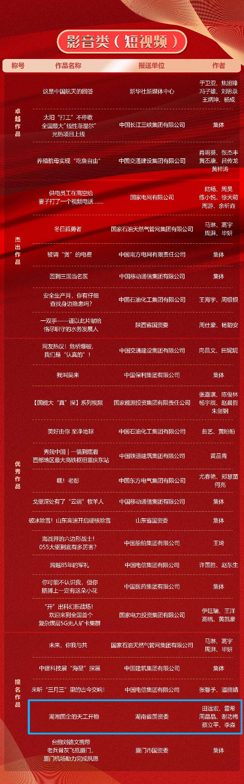 第十一屆“國企好新聞”評(píng)選活動(dòng)由國務(wù)院國資委宣傳局、中國記協(xié)國內(nèi)部指導(dǎo),國務(wù)院國資委新聞中心主辦,《國資報(bào)告》雜志社承辦。本屆“國企好新聞”共征集作品8138件,經(jīng)初審、復(fù)審、終審、公示,共有文字、融媒體、影音、國際傳播、人工智能(AI輔助作品)5類255件作品上榜。其中,由湖南省國資委報(bào)送、央廣交通傳媒(湖南)國資瀟湘團(tuán)隊(duì)原創(chuàng)打造的《湖湘國企的天工開物》獲影音類(短視頻)提名獎(jiǎng),系省內(nèi)唯一獲獎(jiǎng)作品。